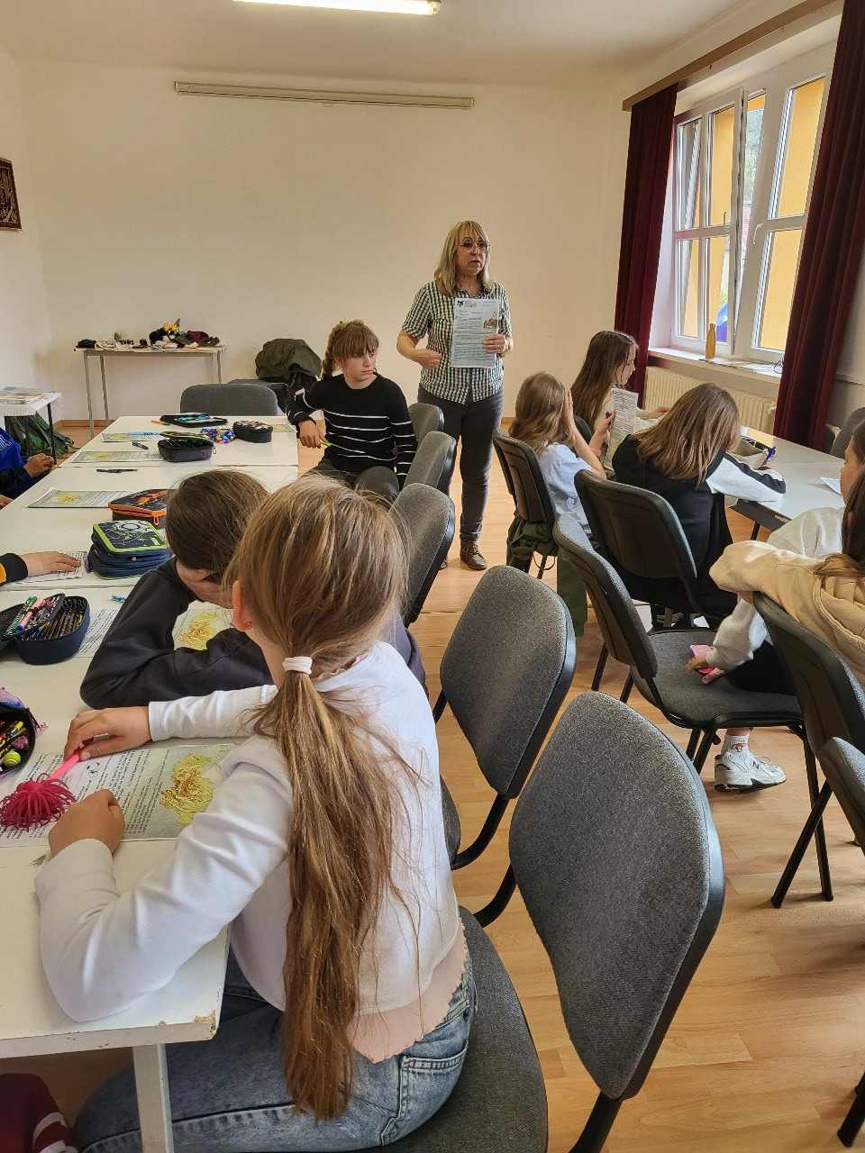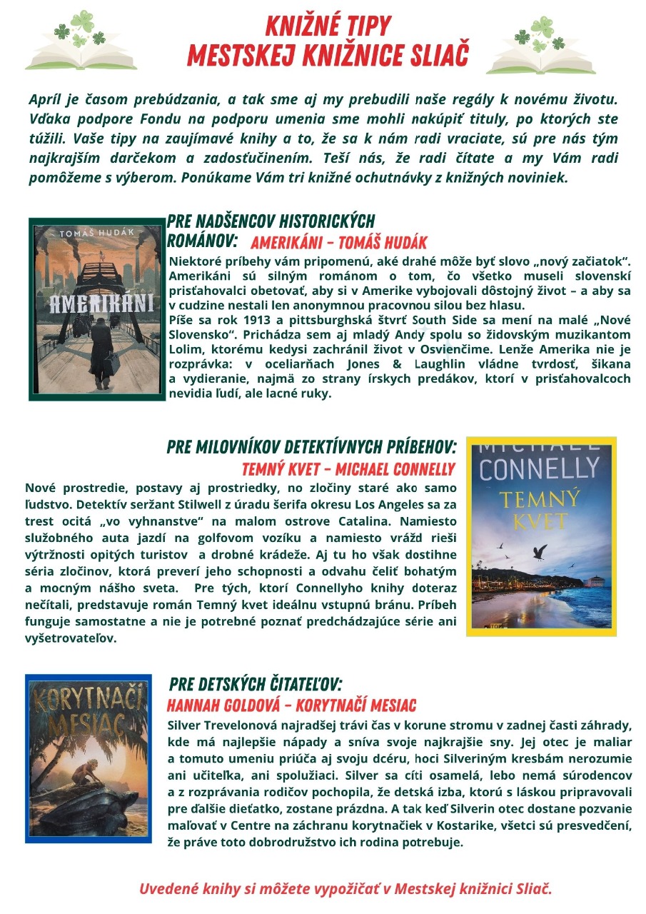V Mestskej knižnici Sliač sme za účasti žiakov 4. ročníka ZŠ v Sliači privítali dňa 16. 04. 2026 lesnú pedagogičku Dagmar Sélešovú z Národného lesníckeho centra vo Zvolene, aby nám predstavila posolstvo 16. ročníka úspešného celoslovenského projektu Les ukrytý v knihe. Každý rok pripravia lesní pedagógovia lákavé témy a tento rok je hlavným mottom kampane Návrat ku koreňom. Zaspomínali sme si na nášho rodáka zo Zvolena, obľúbeného autora detských rozprávok, Jozefa Cígera Hronského. Tento rok si pripomíname 130. výročie jeho narodenia a počas besedy deti prečítali úryvky z jeho knihy Sokoliar Tomáš, na motívy ktorej bola natočená aj filmová rozprávka. Žiaci sa dozvedeli, ako sa sokoliari starajú o dravé vtáky, ako ich trénujú, aké pomôcky k tomu potrebujú a vyskúšali si písanie starodávnym písacím nástrojom, ktoré sa nazýva brko, aby si mohli vlastnoručne podpísať svoj pracovný list. Dozvedeli sa, aké rozpätie krídiel majú naše najväčšie dravce a vyskúšali si to aj na sebe. Takouto hravou formou si deti získavajú vzťah ku knihám a čítaniu a prehlbujú si pozitívny vzťah k prírode a k lesu samotnému. Pochopia, ako sa z malého semenáčika zrodí kniha, ktorá sa im dostáva do rúk a odkrýva svoje tajomstvá.